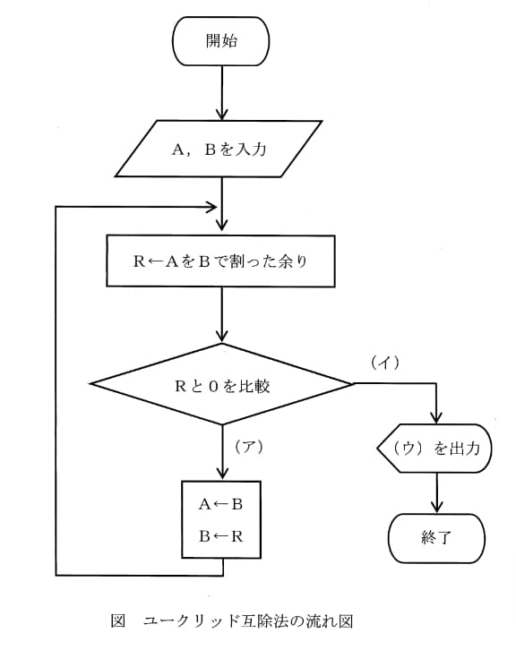 よって、アルゴリズムが継続する(ア)は R≠0、値を出力によりアルゴリズムが終了する(イ)は R=0